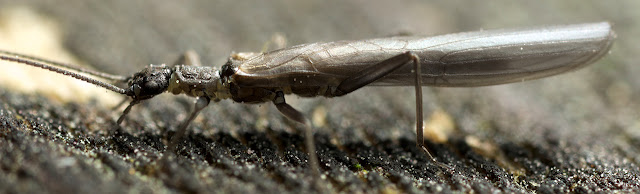 渓流にかかる橋の欄干に細長いカワゲラ。今まで撮影した